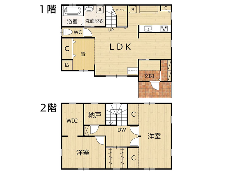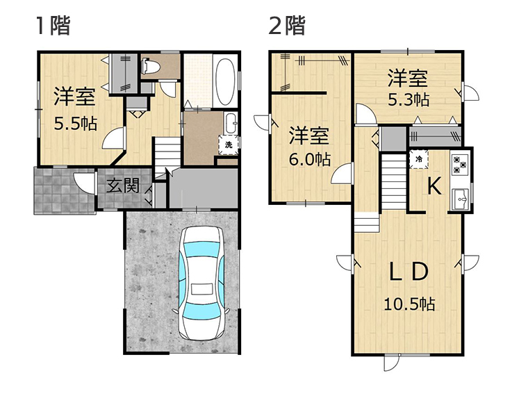 1階は洋室と水回り関係があり、2階はリビングなどの居室があります。